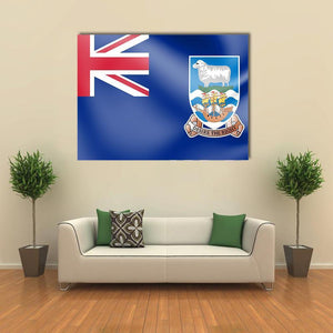This canvas features the Flag of Falkland Island with its coat of arms—the Union Jack in the canton, a ship, a sheep, and the banner reading "DESIRE THE RIGHT." Rendered in a realistic style with blue, white, red, gold, and green tones and composed using the rule of thirds, it carries a proud, historical mood. It suits a home, study, or nautical- and island-inspired room.