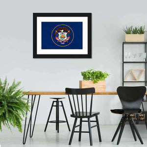 This Flag Of Utah canvas reproduces the Utah state flag and emblem with graphic, emblematic clarity — an eagle with outstretched wings and a shield showing a beehive, tools, and the dates 1847 and 1896 amid stars and stripes. Rendered in a balanced, symmetrical composition and a palette of blue, gold, red, white and brown, it carries a proud, historical, patriotic mood that suits home or office room decor.