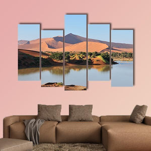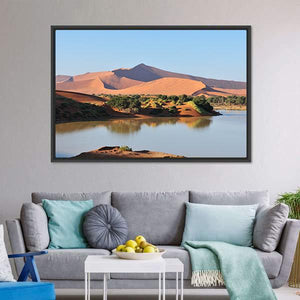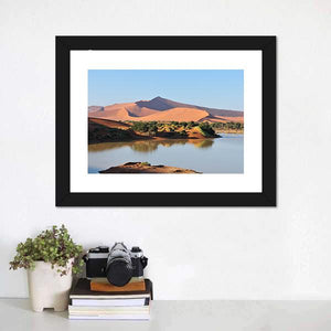 Flooded Sossusvlei Namib Desert captures sand dunes, a calm lake and sparse vegetation in a wide composition where the water mirrors the landscape. Warm orange sands, clear blue sky and green-brown accents create a serene, arid, tranquil mood that suits modern home decor.