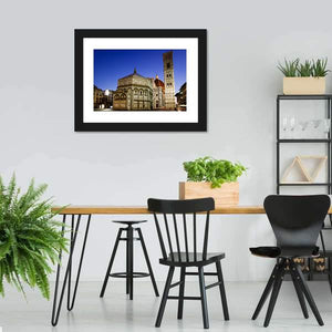 Florence Cathedral Duomo Canvas places the Duomo alongside Giotto’s Campanile and the Baptistery in a photographic nighttime cityscape. Rule-of-thirds composition and a blue, white, brown, red, and grey palette highlight the dome, tower and arches for a historic, grand mood. Suitable as house wall decor for living rooms or entryways.