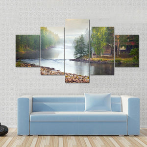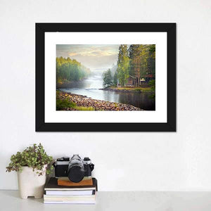 This landscape artwork captures a serene river scene, enveloped in a misty atmosphere with sunlight filtering through lush trees. The tranquil blend of greens and browns invites a natural feel, making it a lovely addition to any space.