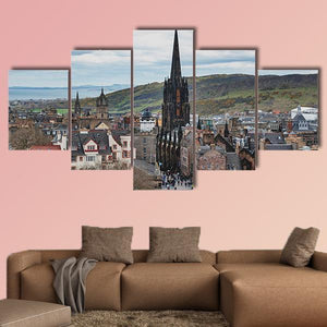 A realistic view of the Royal Mile in Scotland, showing an elevated city skyline with a church steeple and rows of rooftops under an overcast, historic sky. Muted greys, browns, greens, and blues create a subdued, atmospheric print that suits classic or modern home décor.