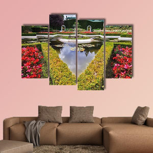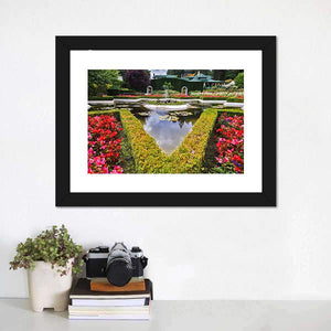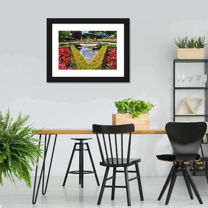 This canvas depicts a formal garden centered on a fountain, with hedges, flower beds, a reflecting pond and birds on the water. The symmetrical, classical gardenscape creates a peaceful, serene mood that fits well in a formal living room, entryway, or home study.