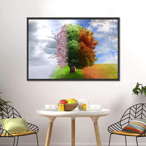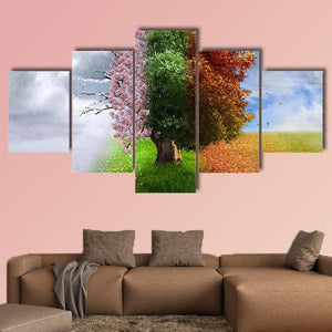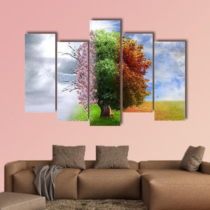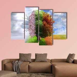Four Seasons Tree Canvas Wall Art shows a single tree depicted in spring, summer, autumn and winter, with a symbolic, artistic mood. The abstract, modern composition follows the rule of thirds and blends green, brown, pink, yellow and blue to suggest seasonal change. It suits modern room decor as a colorful nature accent.