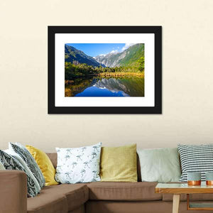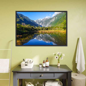 Franz Josef Glacier reflects across a calm lake, its snow-capped peaks mirrored in still water and framed by dense green forest. Rendered realistically with a symmetrical composition and a blue‑green‑white‑brown palette, the scene reads as serene and majestic. Suits modern home settings like living rooms or bedrooms seeking peaceful, nature-focused wall decor.