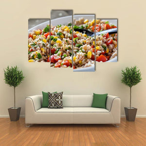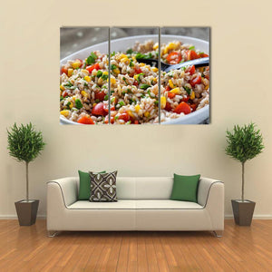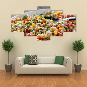 Orzo Salad Canvas Wall Art shows a close-up grain salad—barley, corn, cherry tomatoes, and parsley—in warm browns, yellows, reds, and greens. The colorful, appetizing image brings a fresh, healthy mood that suits kitchens, dining areas, or casual eating spaces.