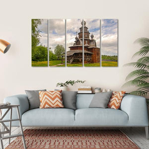 This serene canvas features a rustic wooden church nestled among lush trees and a peaceful field, with soft clouds in a tranquil sky. It captures a historical vibe, making it a beautiful addition to any living space or study.