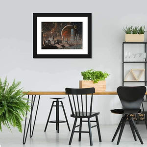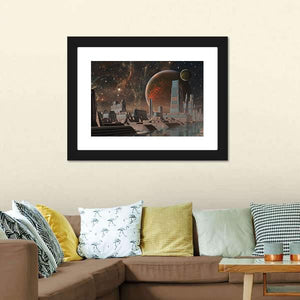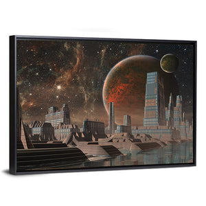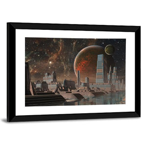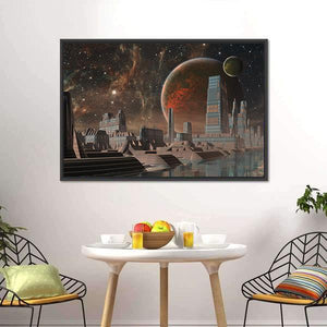 This captivating wall art features a futuristic city set on an alien planet. A vibrant landscape comes alive with towering buildings, a large red planet, and a smaller moon, creating an otherworldly atmosphere.