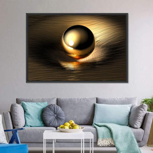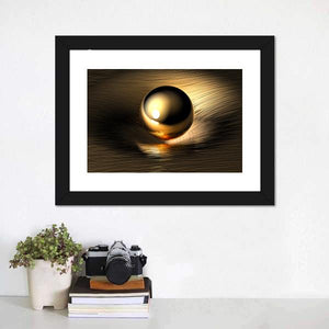 This abstract artwork features a mesmerizing gold sphere with a metallic texture, casting a shadow against a deep, ribbed background. Its luxurious and dynamic palette of gold, black, and white adds a modern touch to any space.