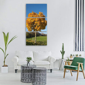 A realistic image of a golden autumn tree with yellow and orange foliage set in a field beneath a blue sky, with a small fence post in the foreground. The rule-of-thirds composition feels vibrant, cheerful, and naturally warm. It suits modern interiors and room decor as a nature-focused wall accent.