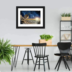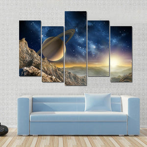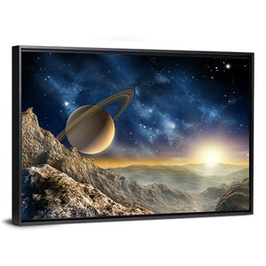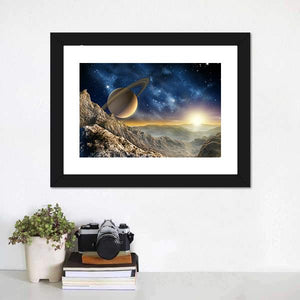 This canvas art features a breathtaking view from a moon of Saturn, showcasing a ringed planet against a starry sky. The serene colors of blue, gold, and brown evoke a mysterious, cosmic atmosphere that adds depth and intrigue to your space.