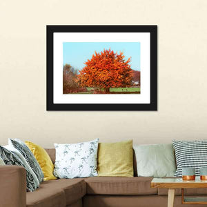 This realistic landscape centers on a large tree with vibrant orange leaves set beside a field under a clear sky, conveying a calm autumn scene. Composed with the rule of thirds, the print brings a vibrant, peaceful mood that suits modern home interiors.