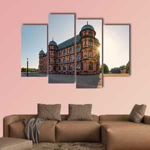 This photorealistic canvas depicts a historic palace with domes and a sunlit courtyard, showing cobblestone paths and a grass lawn beneath a clear sky with thin clouds. Its grand, serene mood and warm pink-blue-gold palette fit well in modern or traditional room decor—think living rooms, entryways, or studies.