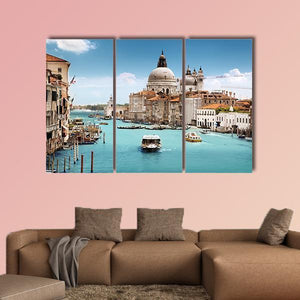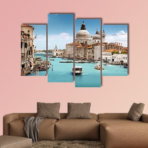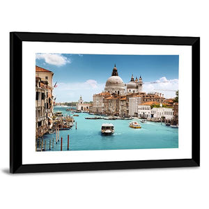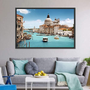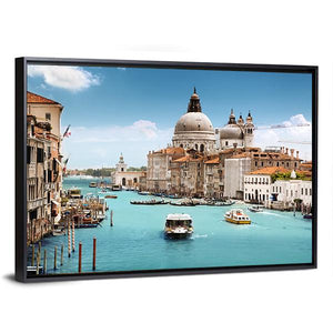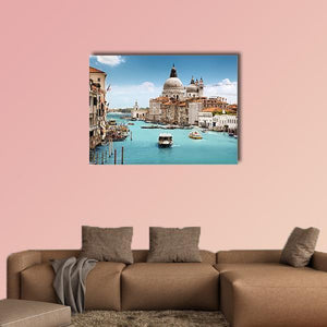 A photographic cityscape of the Grand Canal and a domed basilica in Venice, showing boats and historic buildings reflected on the water. Blue, white, brown and gold tones give the scene a vibrant, travel-minded, historic atmosphere. This cityscape fits well as room decor in modern living rooms or hallways.