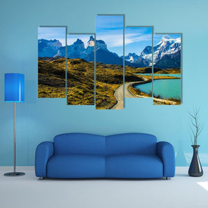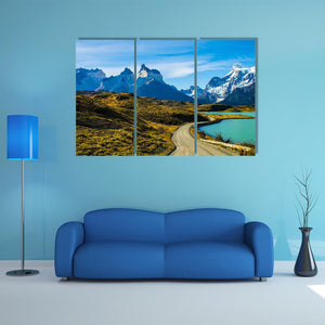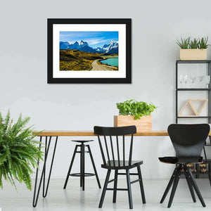 This photorealistic landscape features a winding dirt road leading past a turquoise lake toward snow-capped mountains. The scene reads serene, majestic, and a little adventurous, with blues, greens, browns, white, and yellow in the palette. Suits modern homes and nature-inspired room decor.