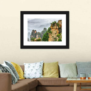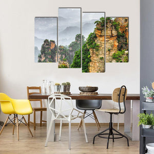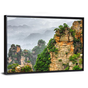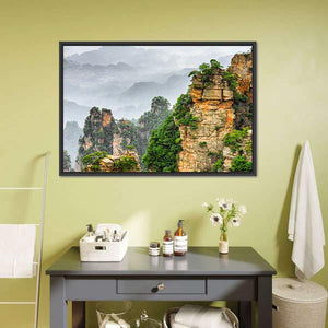 This canvas artwork captures the majesty of Zhangjiajie National Forest Park, showcasing misty mountains and tall rock formations enveloped in dense green trees. Its serene and atmospheric palette invites a tranquil vibe, perfect for nature lovers.