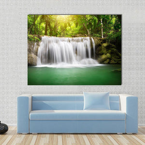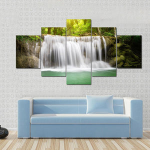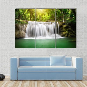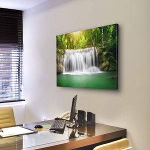 This serene piece captures a beautiful waterfall amidst lush green foliage, with sunlight filtering through the trees. Its photorealistic style brings the tranquility of nature into your space.