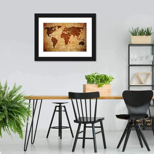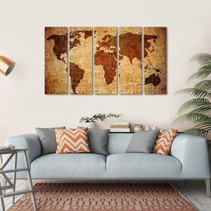 This world map canvas art features a vintage, rustic charm with a brown and beige palette. Its distressed texture and faded appearance evoke a sense of nostalgia, making it a great addition to any wall decor.