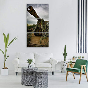 Gun For War — France captures a close-up of artillery wrapped in camouflage netting with a rusted barrel and an overcast sky. The image reads gritty and weathered, with brown, green, grey, and tan tones that give a vintage, historical mood. It suits military or history-themed rooms and wall decor.