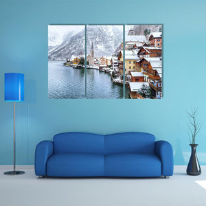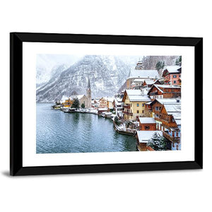 This landscape artwork captures the serene beauty of Hallstatt, Austria, featuring a picturesque mountain village blanketed in snow. The calming scene showcases snow-covered rooftops, tranquil lakefront homes, and a charming church steeple, perfect for adding a touch of winter elegance to your space.