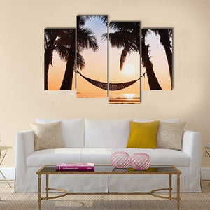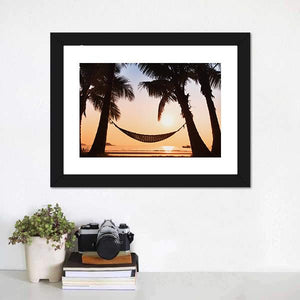 This landscape canvas art features a serene beach scene, showcasing palm trees and a hammock during a tranquil sunset. The warm palette of orange and blue creates a peaceful atmosphere, perfect for enhancing any room.