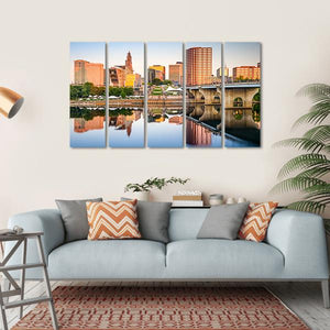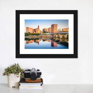 Capture the serene beauty of Hartford's skyline with this canvas wall art, featuring a stunning wide-angle view of the city. The peaceful reflections of buildings in the water during the late afternoon sun create an inviting urban atmosphere.