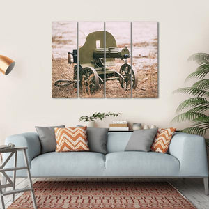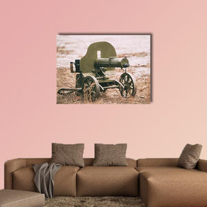 This canvas art showcases a historic Maxim machine gun set against a rugged field. With its earthy tones of green and brown, it brings a vintage military feel to any space.