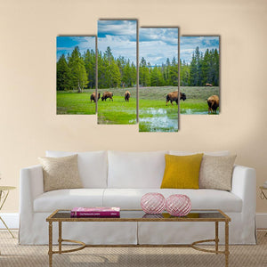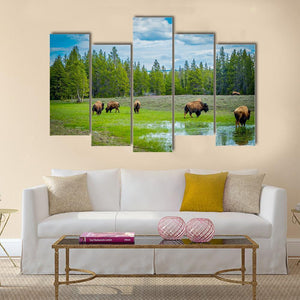 A wide view of a herd of five bison in a lush green field, with pine trees and clouds in the background and reflections in a foreground puddle. The peaceful, natural scene gives a calm, serene feeling and suits modern or nature-themed rooms.