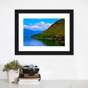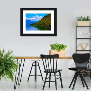 This landscape art captures the serene beauty of Lake Atitlan, featuring vibrant green hills, a tranquil lake, and a clear blue sky. The reflective water surface adds a natural touch, making it a delightful addition to any space.