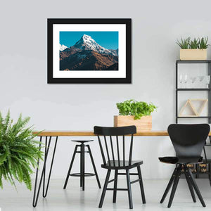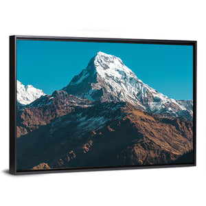 This canvas art features the majestic snow-capped Himalaya Mountains against a clear blue sky, capturing the serene beauty of nature. The distinct shadows on the rocky terrain and patches of snow create a stunning visual depth, bringing a piece of Nepal's awe-inspiring landscape into your home.