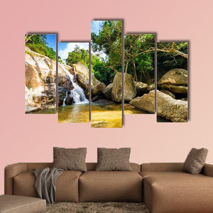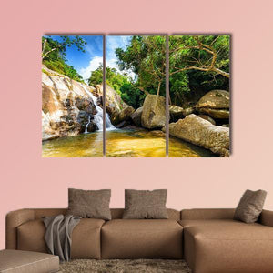 Hin Lad Waterfall in Thailand shows water cascading over rocks, surrounded by lush green trees and a clear blue sky. This realistic landscape print has a serene, natural mood and works well in modern or nature-inspired rooms at home.