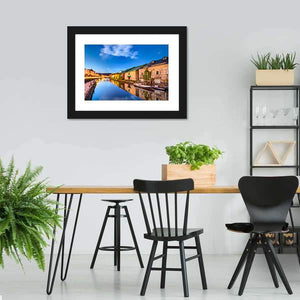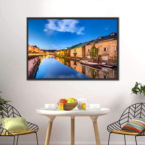 A realistic canvas showing a historic canal in Japan, with old‑world buildings, a single docked boat, and still water that reflects the twilight sky. Soft blues and warm streetlight tones create a peaceful, calm atmosphere that suits modern living rooms or hallways.