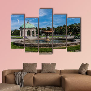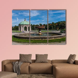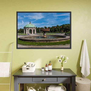 Hofgarten Park Munich Canvas Wall Art captures the park’s temple, circular fountain, tree-lined paths and wispy clouds. Rendered in greens, blues, browns and greys with a rule-of-thirds composition, the realistic scene feels serene, peaceful and grand and works well as home wall decor.