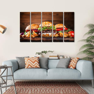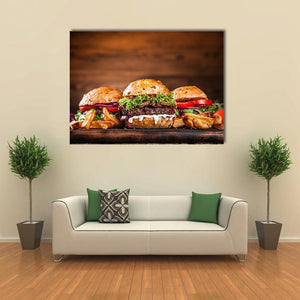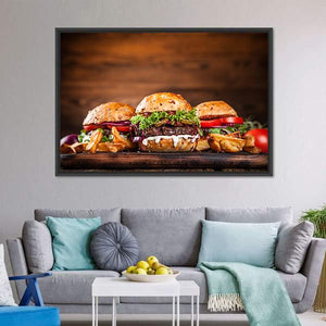 This canvas art features a close-up of three gourmet burgers paired with golden potato wedges. With a rustic vibe and an appetizing color palette of browns, greens, and reds, it's a perfect piece for any culinary enthusiast's kitchen or dining area.