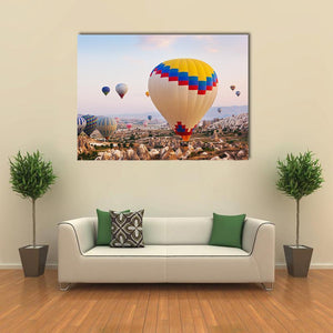 This canvas wall art captures hot air balloons soaring above Cappadocia's unique rock formations. The serene mix of colors creates an adventurous and awe-inspiring atmosphere, perfect for any space seeking a touch of wonder.