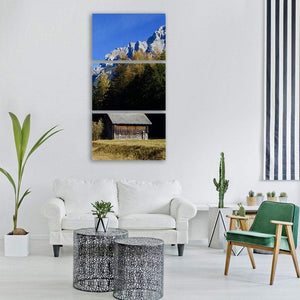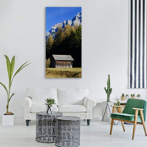 A wooden cabin sits tucked into an autumn forest beneath alpine mountains, with a noticeable weathered wood texture on the cabin. The landscape reads serene and rustic, a quiet, autumnal scene that works well in rustic or nature-inspired rooms.
