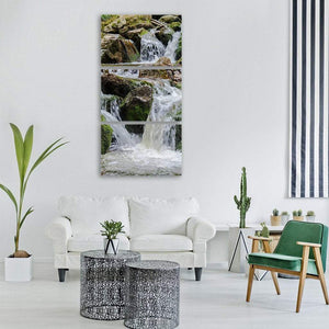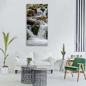 Ilse Falls shows a realistic waterfall scene with water cascading over wet rocks and moss, creating a serene, natural mood. The green, white, brown and gray palette suits natural or modern interiors and works well as room decor.
