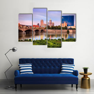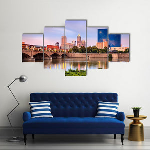 This canvas print captures the serene beauty of the Indianapolis skyline at sunset, showcasing tall buildings and a graceful arched bridge reflected in the calm water below. The vibrant colors of blue, purple, and orange create a reflective atmosphere that's perfect for any wall space.