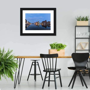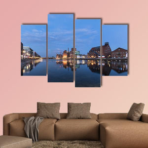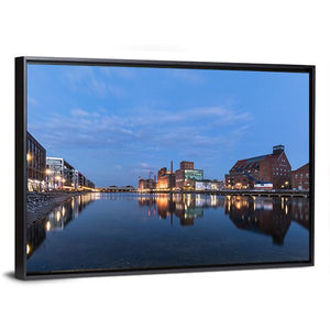 This realistic cityscape of Duisburg’s inner harbor shows industrial buildings along the waterfront, their lights mirrored in the water at dusk. Rendered in blues, browns and orange highlights, the wide-angle scene feels calm and reflective and suits modern or industrial interiors.