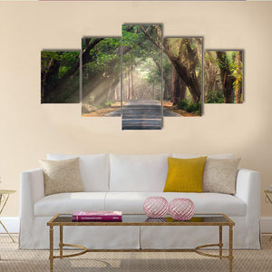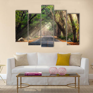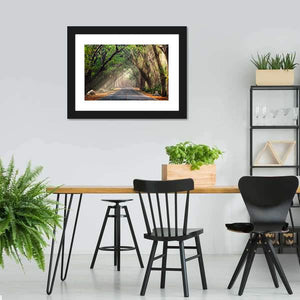 This realistic landscape shows a tree tunnel and a road with sunbeams breaking through the canopy, rendered in greens, browns, grays, and soft yellows. Its leading lines and atmospheric depth create a serene, inviting scene that fits modern homes and nature-themed rooms.