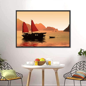 This canvas features a serene sailboat gliding through Ha Long Bay, surrounded by islands. The warm palette of orange, red, and blue creates a tranquil atmosphere, perfect for bringing a touch of nature into your space.