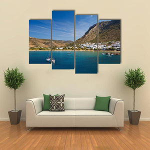 Kamares Beach & Village captures a serene coastal town with white buildings clustered on a hillside, a sailboat on calm blue water, and a clear blue sky with wispy clouds. Rendered in a realistic landscape style with blue, white and green tones, it suits coastal or modern interiors like living rooms and bedrooms.