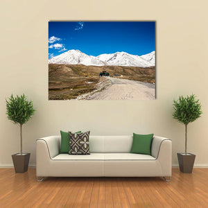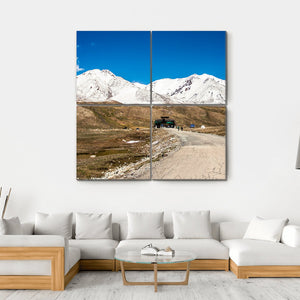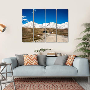 This canvas wall art captures the majestic snow-capped mountains of the Karakoram range, framed by a clear blue sky and fluffy white clouds. The eye-level view of a road with dark green vehicles adds a sense of adventure and vastness to your space.
