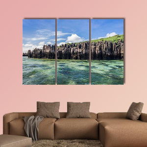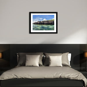 Karts In Emerald Sea shows a wide, eye-level view of a rocky coastline and clear turquoise tropical ocean, with jagged rock formations and fluffy white clouds. Its realistic blue-green palette creates a serene, natural mood that feels calm and tranquil. The piece suits modern or coastal room decor as a quiet focal point.