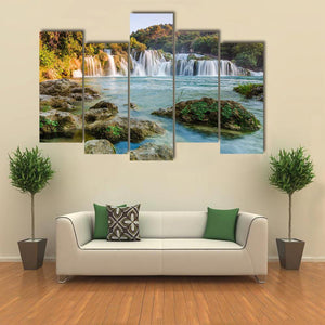 Krka River Waterfalls Canvas captures a serene river waterfall with rocks and trees, the falling water shown with soft motion blur. The composition uses depth and the rule of thirds to lead the eye through the scene. Its green, blue and brown palette and rustic, natural mood fits living rooms or other nature‑inspired spaces.