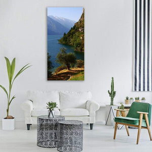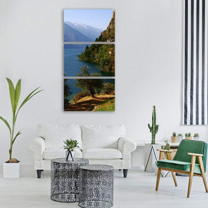 Lake Garda Shore Path with Snow-capped Peaks Vertical Canvas Wall Art