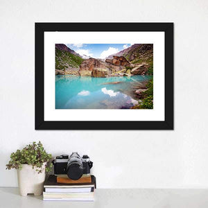A realistic mountain-lake scene that puts clear turquoise water, rocky mountains, and cloud reflections front and center. The composition uses depth and the rule of thirds to create a serene, majestic, and tranquil atmosphere. Suited to modern living spaces as a nature-focused piece of room decor.