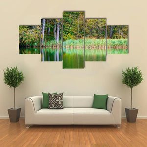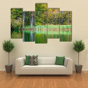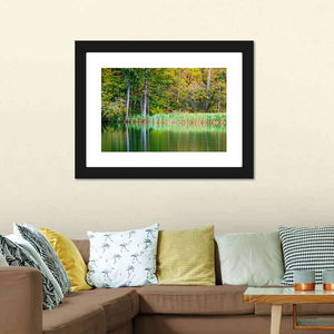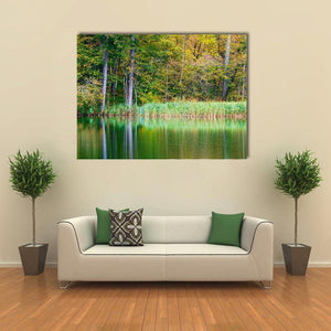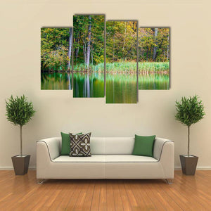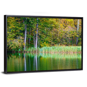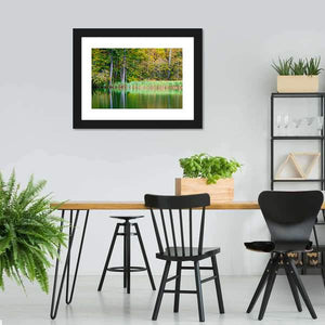 This canvas artwork features a tranquil depiction of a forest and lake, capturing the serene beauty of nature. The soft greens, yellows, and browns blend harmoniously, evoking a sense of peace and calm.