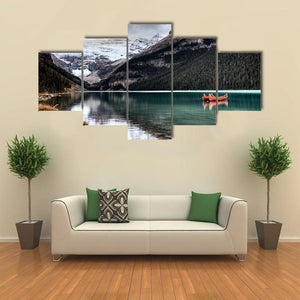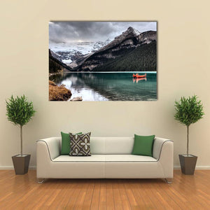 This realistic canvas shows Lake Louise framed by snow-capped mountains, a dark evergreen forest and a bright orange canoe on calm, reflective water. The rule-of-thirds composition and cloudy, dramatic sky give a serene, awe-inspiring mood that suits modern or nature-inspired rooms.