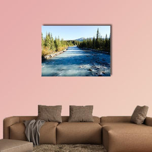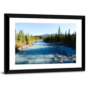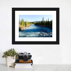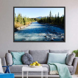 Lake Louise Village Canvas Wall Art depicts a river winding through a dense evergreen forest with mountains under a bright blue sky. Rendered in a realistic style using blue, green, brown and white tones, it gives a peaceful, natural, serene feeling. Fits well in modern or nature‑themed rooms as wall decor.